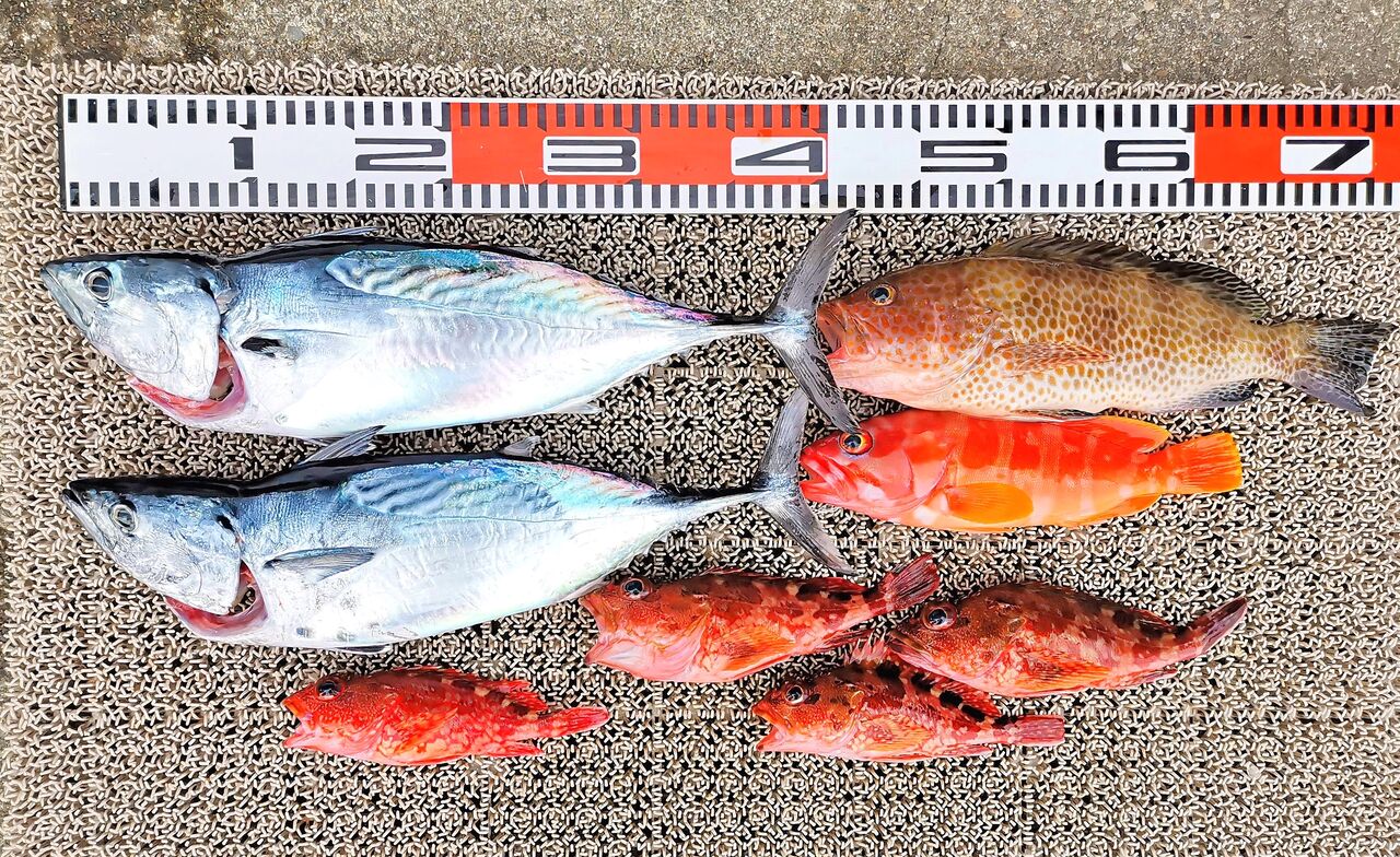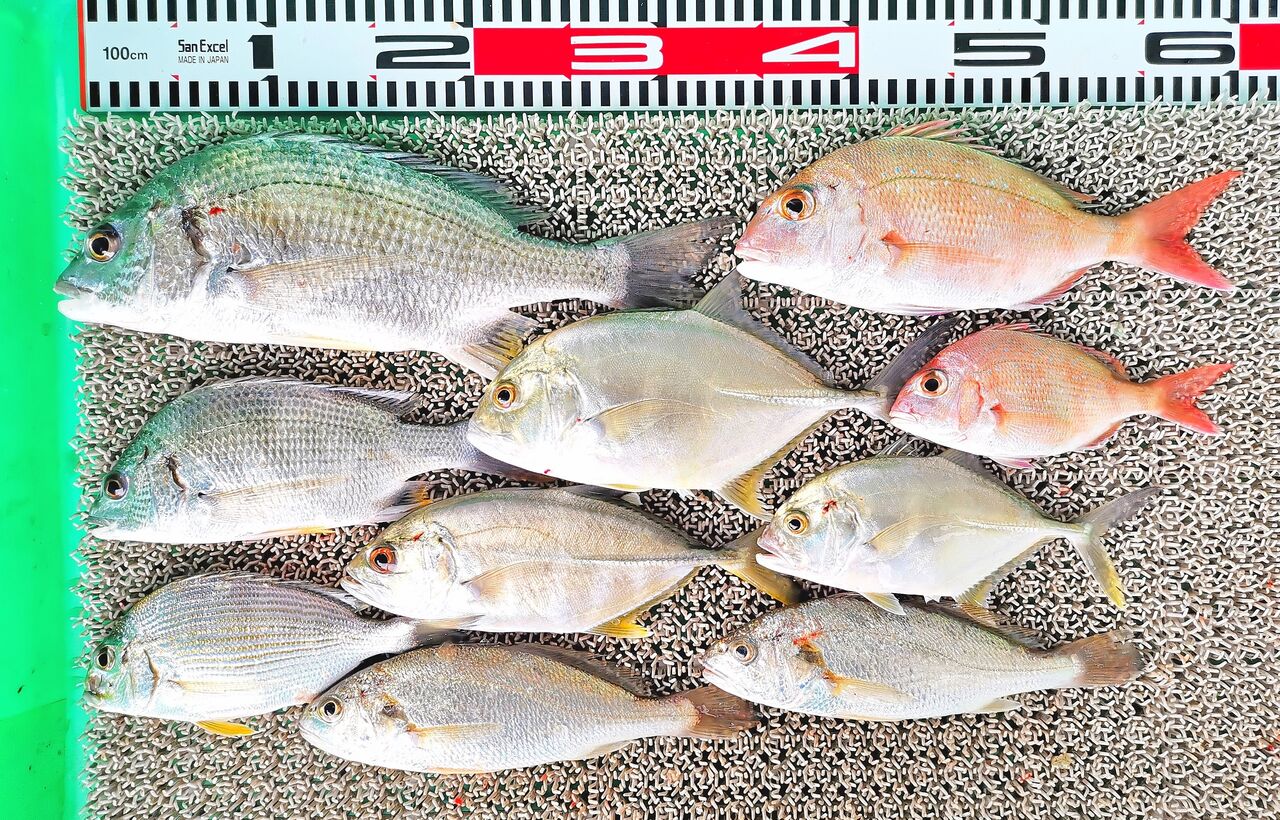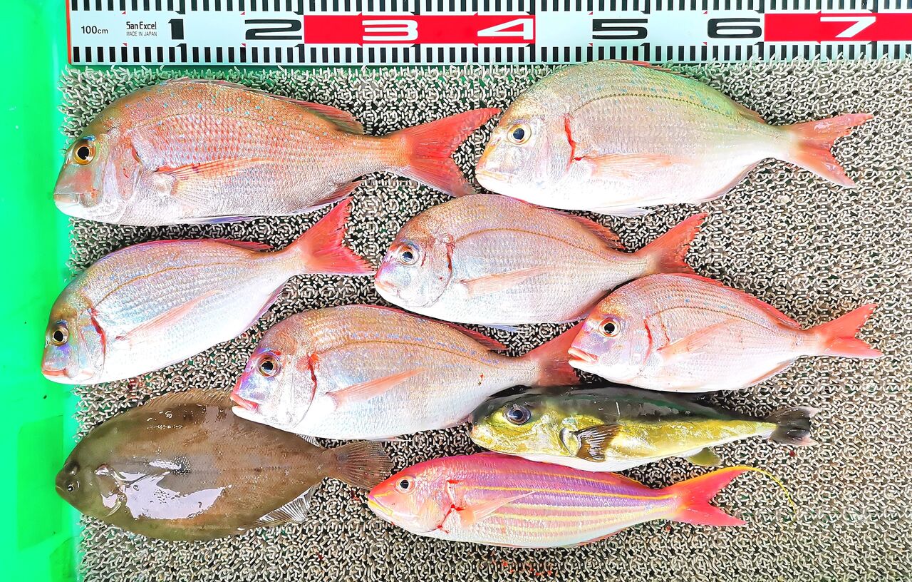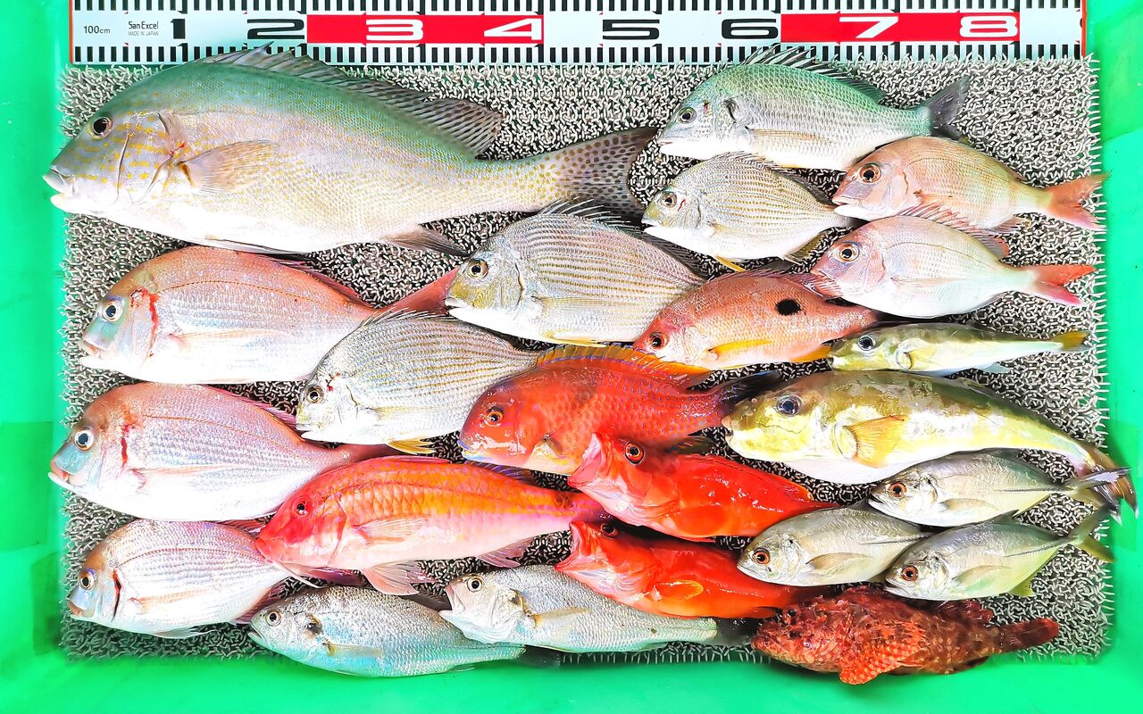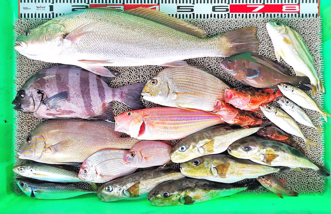 T原さん5人組、コロダイ、チダイ3匹、ヒョウゴ3匹、マダイ2匹、アカハタ2匹、キビレ、メンドリ、テス、アカイサギ、ギンフグ、イシモチ、エバ3匹、オニカサゴなど。